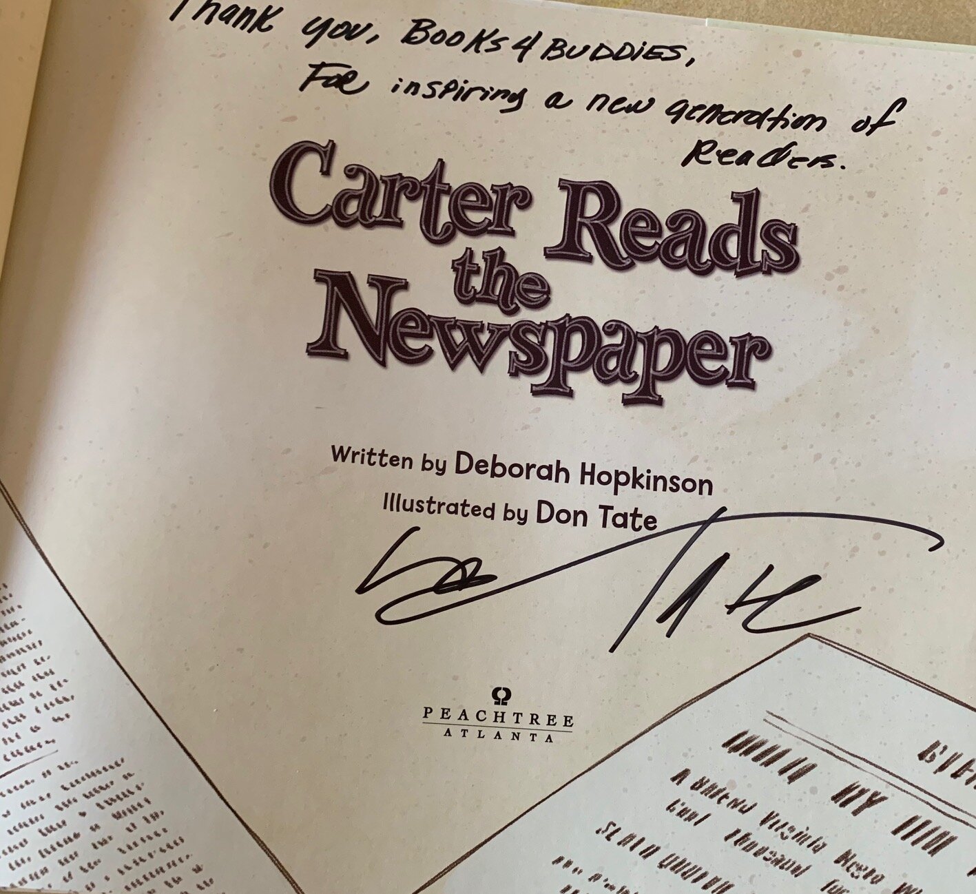 A small group met Don Tate, illustrator/author in 2017 at BGSU's annual Literacy in the Park sponsored by the Conda family. He was so impressed with the group of young men/Ambassadors, he dedicated 'Carter Reads The Newspaper' (published February 2019) to Books4Buddies.
